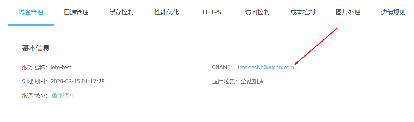 test1.lete114.top域名CNAME解析到lete-test.b0.aicdn.com